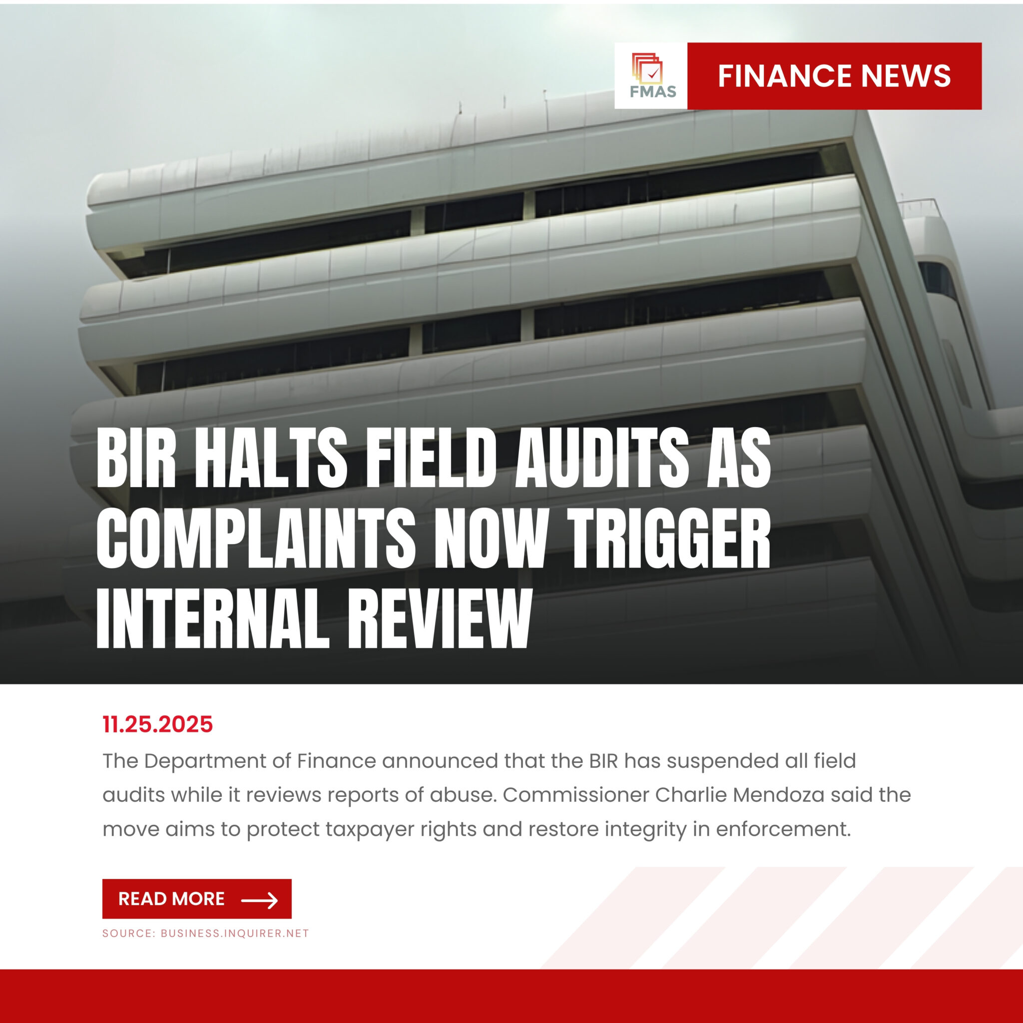 The BIR has suspended all field audits after the Department of Finance received rising complaints of abuse. Commissioner Charlie Mendoza said the move will allow…