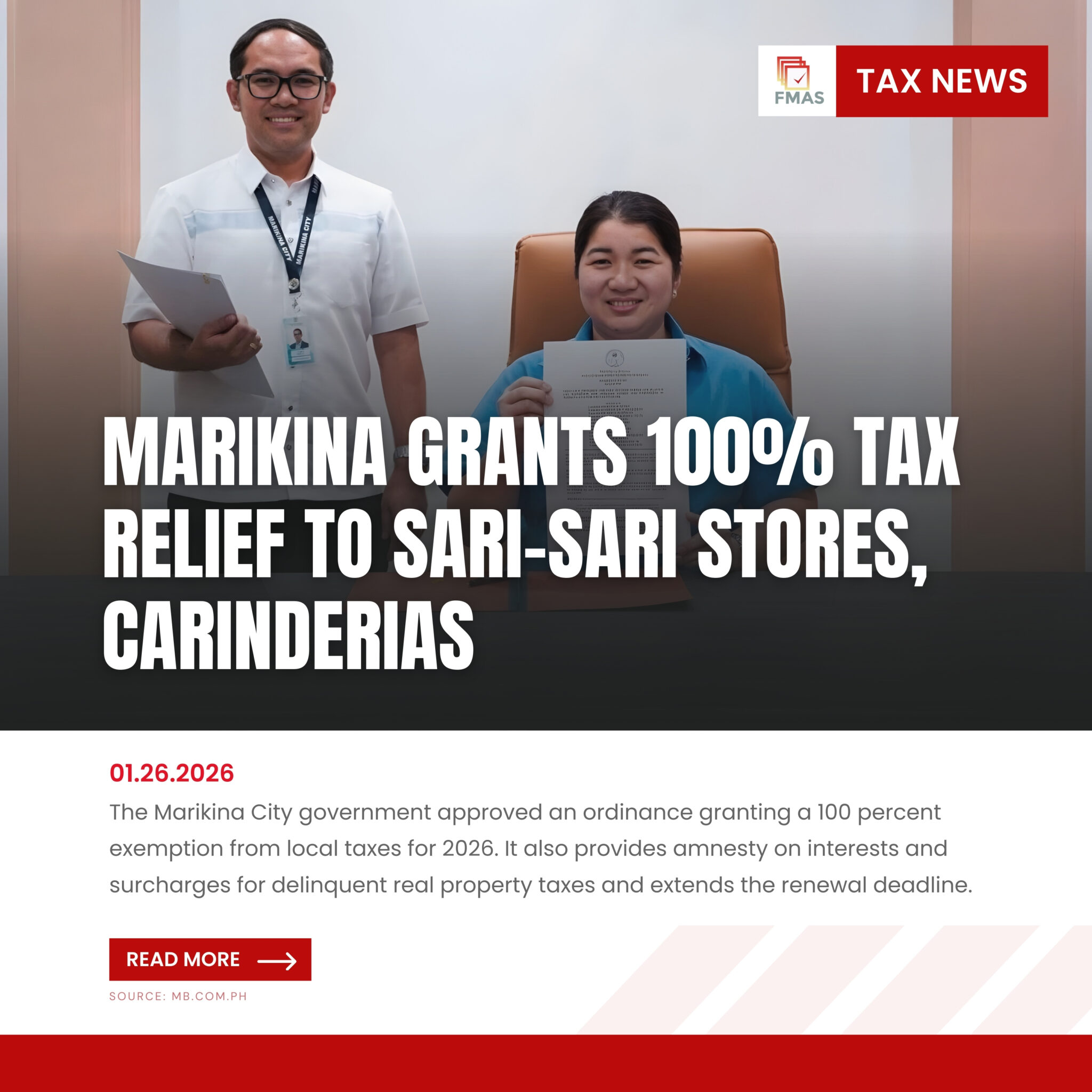 The Marikina City government approved an ordinance granting a 100 percent local tax exemption for qualified sari-sari stores and carinderias in 2026, provided they do…