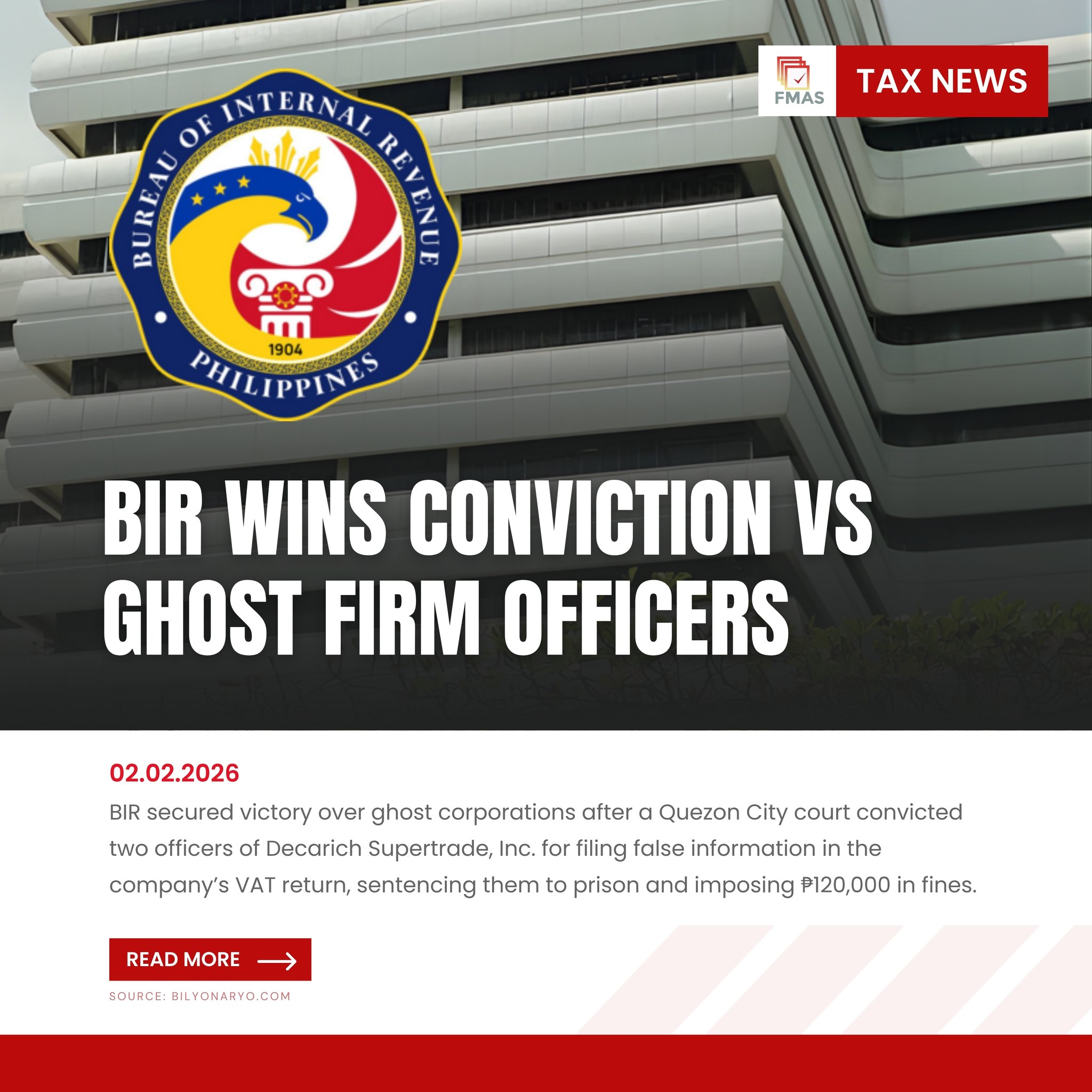 The Bureau of Internal Revenue marked a significant step in its drive against ghost corporations as a Quezon City court found two officers of Decarich…